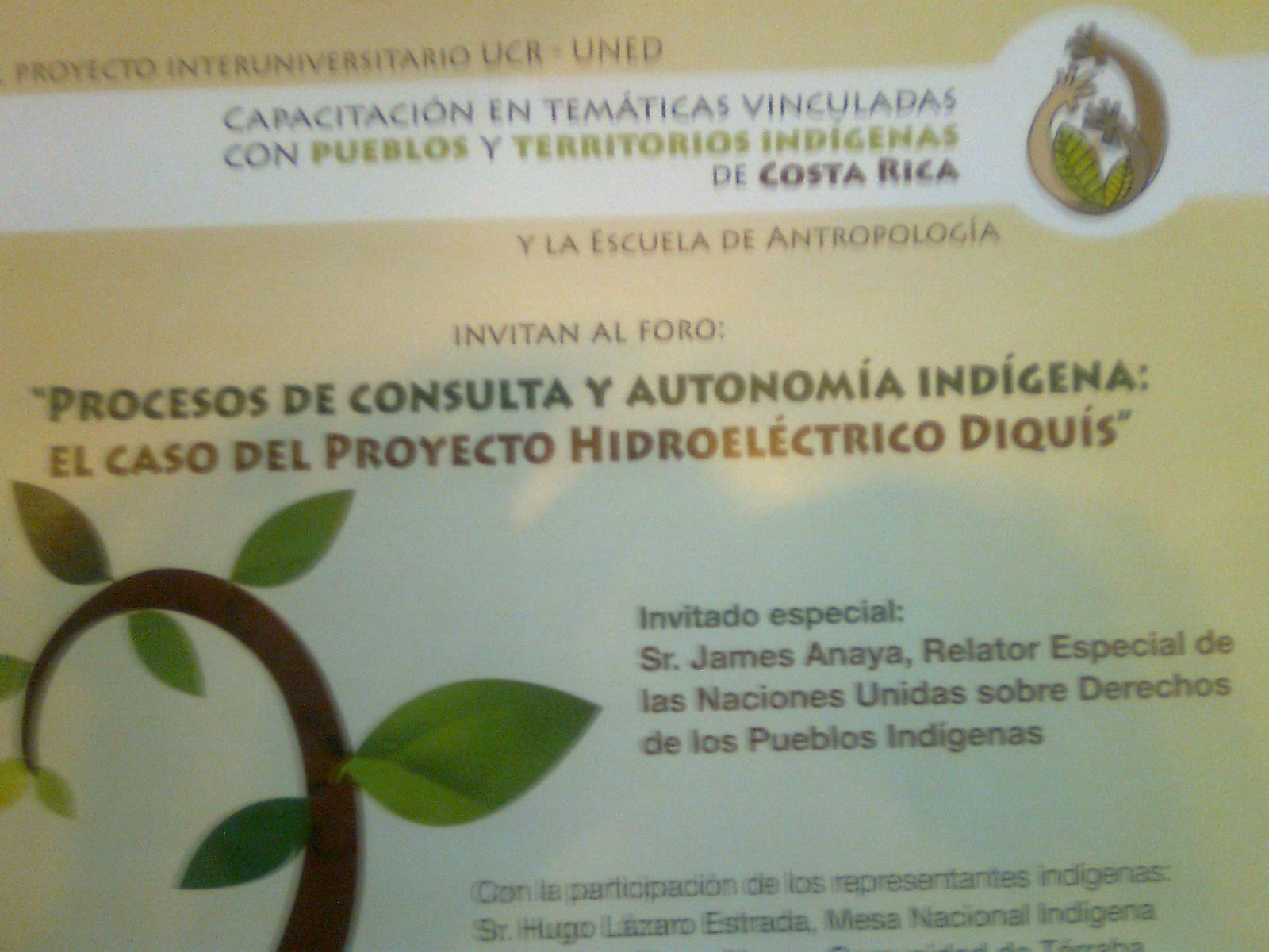 The Special Rapporteur on the rights of indigenous people, James Anaya, visited Costa Rica last 25-27 April 2011. He was invited by the Government to assess the impact of the hydroelectric dam “El Diquis”, that will be built in the indigenous territory of Terraba, on the local communities settled in this area. In other words, his task was to verify if the hydroelectric project carried out by Costa Rica Government would imply a violation of indigenous people’s rights.On April 25 and 26, the Special Rapporteur had a meeting with members of the indigenous communities affected by the hydroelectric project, to which followed, on April 27, a public Forum titled “The consultation process and the indigenous autonomy: the case of the hydroelectric project of Diquís”, organised by UNED (Universidad Estatal a Distancia) and UCR (University of Costa Rica). Ivania Villalobos on behalf of VIDES Costa Rica attended the meeting.